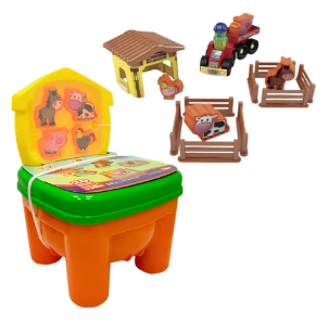 Uma cadeira que guarda um mundo de fantasias! Em seu interior está acondicionado um kit fazendinha completo, com muitas cerquinhas animaizinhos e tem até um fazendeiro em seu trator, são 20 peças de plástico, para inventar as mais loucas aventuras na fazenda.
